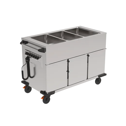 - Speisentransportwagen aus Edelstahl oben 3 tiefgezogene Warmhaltewannen