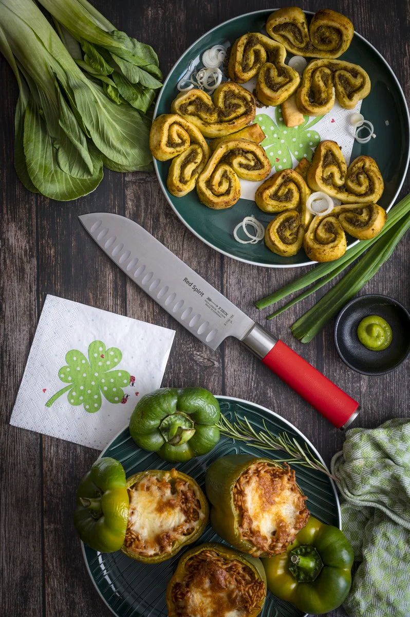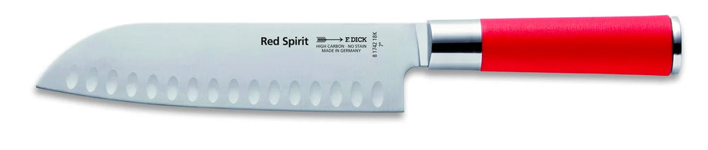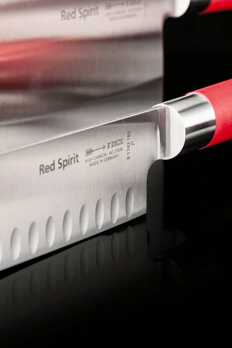 Das Santoku aus der Serie Red Spirit gilt als asiatischer Klassiker für Gemüse und Fleisch und gehört damit zum Basissortiment in der Küche. Es zeichnet sich durch eine dünne Klinge mit keilförmigem Anschliff aus. Das spitze Klingenende dient zum Dekorieren. Durch den Kullenschliff entstehen Luftpolster, die das Anhaften des Schnittguts an der Klinge reduzieren.