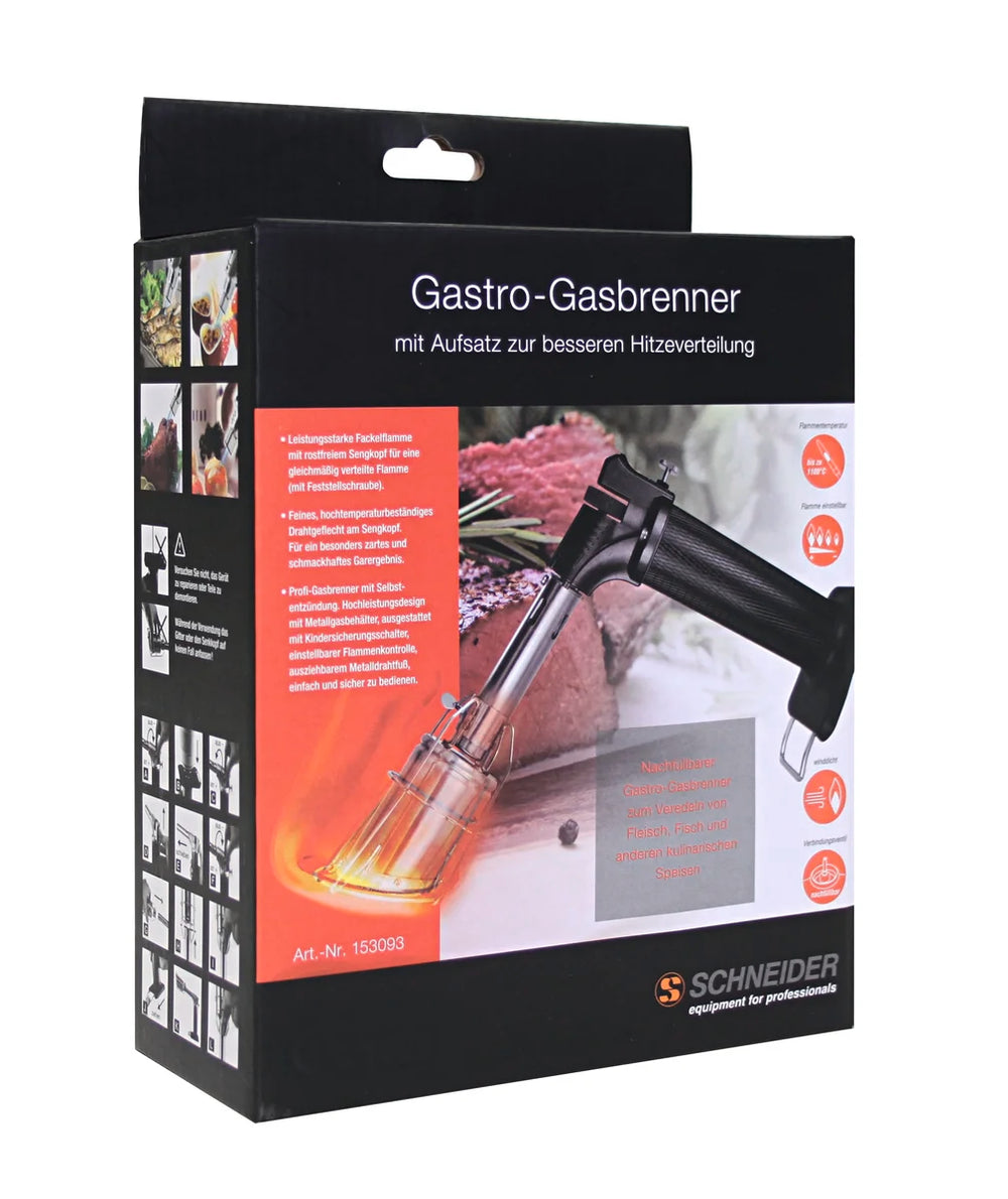 - Nachfüllbarer Gastro-Gasbrenner zum Veredeln von Fleisch, Fisch und anderen kulinarischen Speisen.