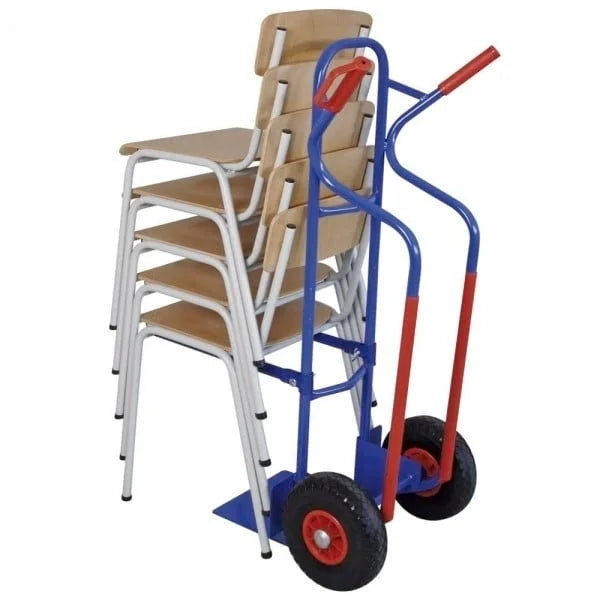 Mit dieser Stuhlkarre transportieren Sie Stuhlstapel schnell und unkompliziert. Geschweißte Stahlrohr-Konstruktion mit Treppenrutschkufen, in Farbe blau RAL 5010 kunststoffbeschichtet. Rote Sicherheitsgriffe mit Handschutzbügeln aus hochwertigem Kunststoff. Bereifung 2 pannensichere Reifen, Rad-ØxB 260 x 80 mm.