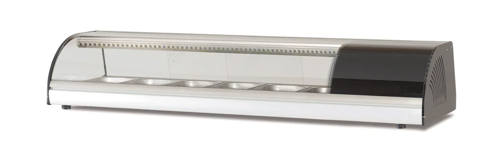 Die Sushi-Vitrinen der PROFI-Serie sind durch die abgerundete Frontscheibe ideal zum Verkaufen und Präsentieren von Sushi geeignet. Die Bestückung erfolgt durch Schiebetüren auf der Rückseite und durch die LED-Innenraumbeleuchtung wird jeder Gast auf die angebotenen Waren aufmerksam gemacht. Die Vitrine besteht aus Chrom-Nickel-Stahl und die Front aus Einscheiben-Sicherheitsglas.Produktvorteile im Überblick: