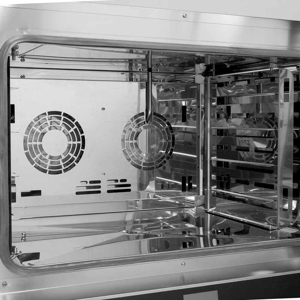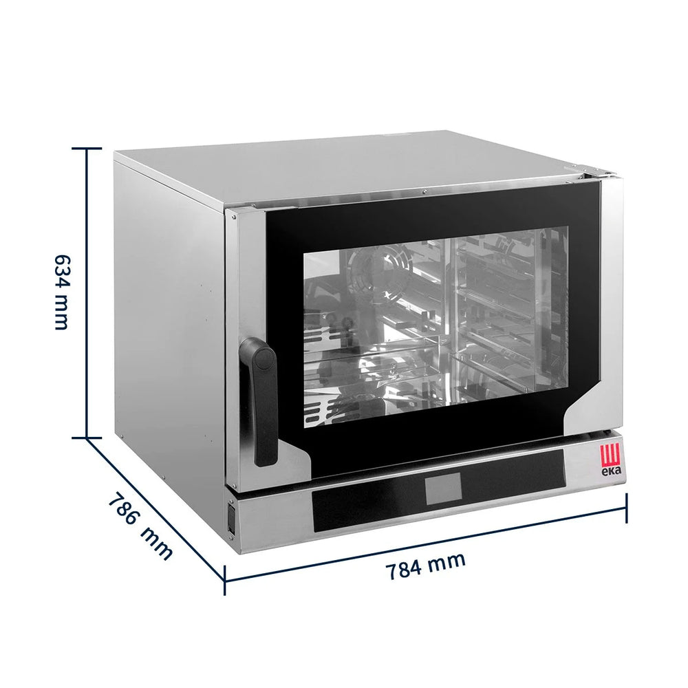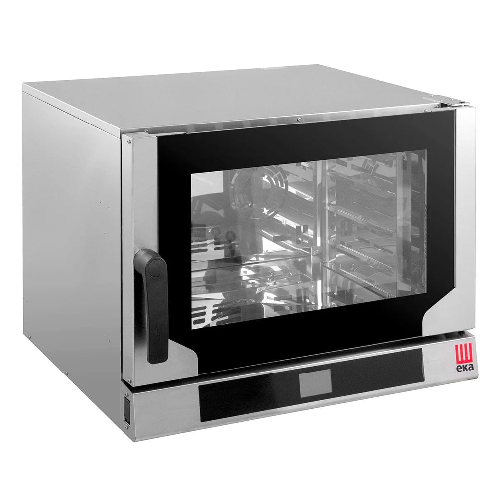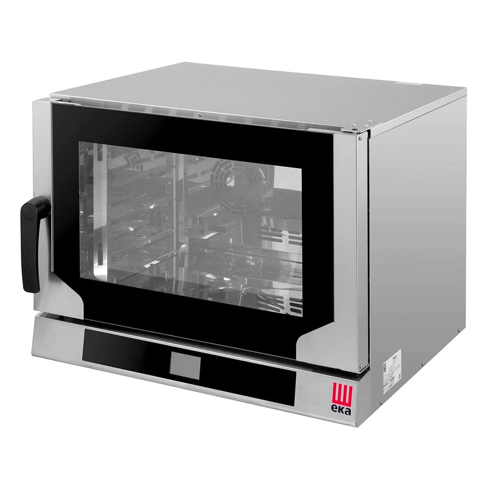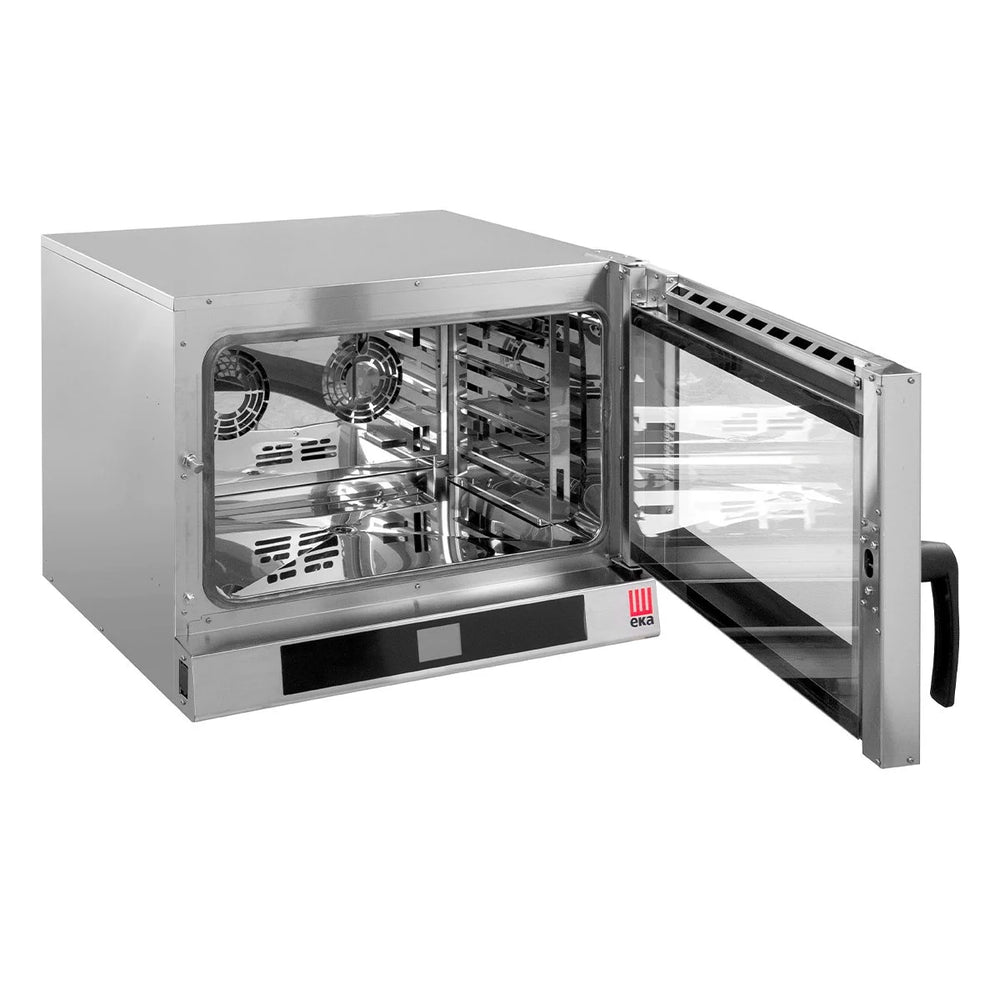 Der digitale Elektro-Konvektionsofen mit Dampf von Tecnoeka ist ideal geeignet für Torten, Snacks, Backwaren und gefüllte oder ungefüllte Croissants. Der Ofen verfügt über eine direkte Dampffunktion mit der jeder Garvorgang individuell gestaltet werden kann, eine innovative elektronische Bedienblende mit 100 Programmen und 5 Garphasen, jede davon mit Zeit-, Temperatur- und Befeuchtungseinstellungen, gesteuert.