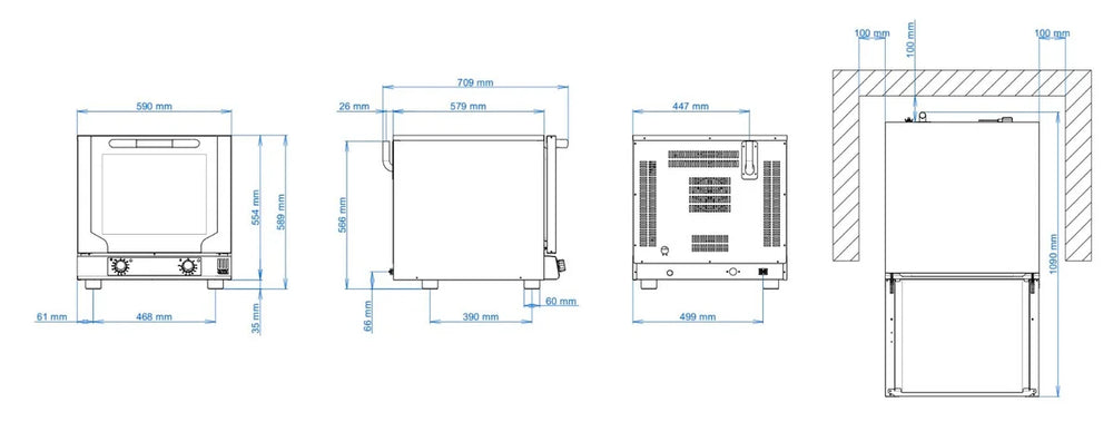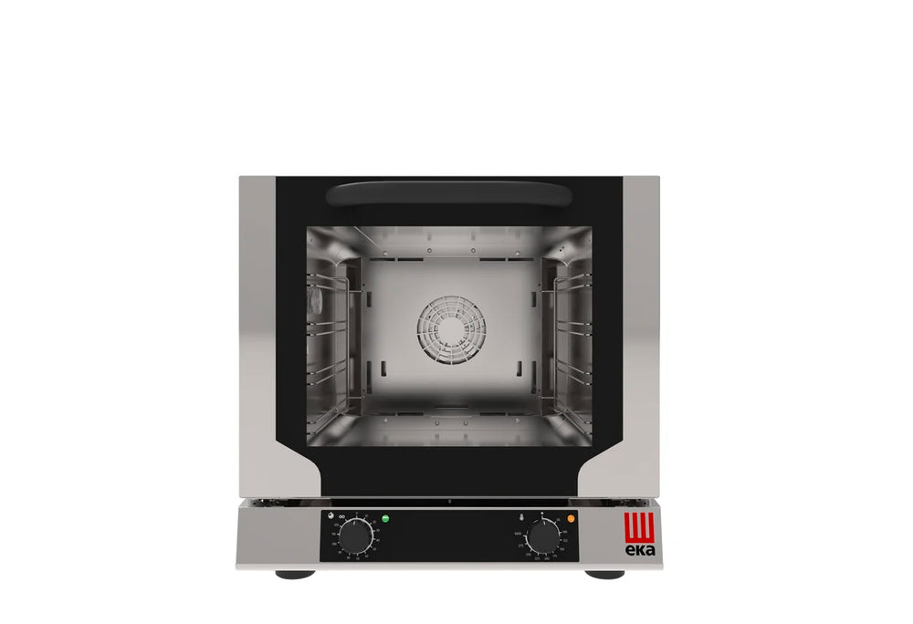 Der elektrische Umluft-Konvektionsofen ist dank der analogen Bedienblende leicht zu bedienen und einzustellen. Der Ofen besitzt einen Garraum aus AISI 430 und eine Tür mit Umluft-Sichtglas. Für leckere Snacks, die Ihren Kunden schmecken werden.