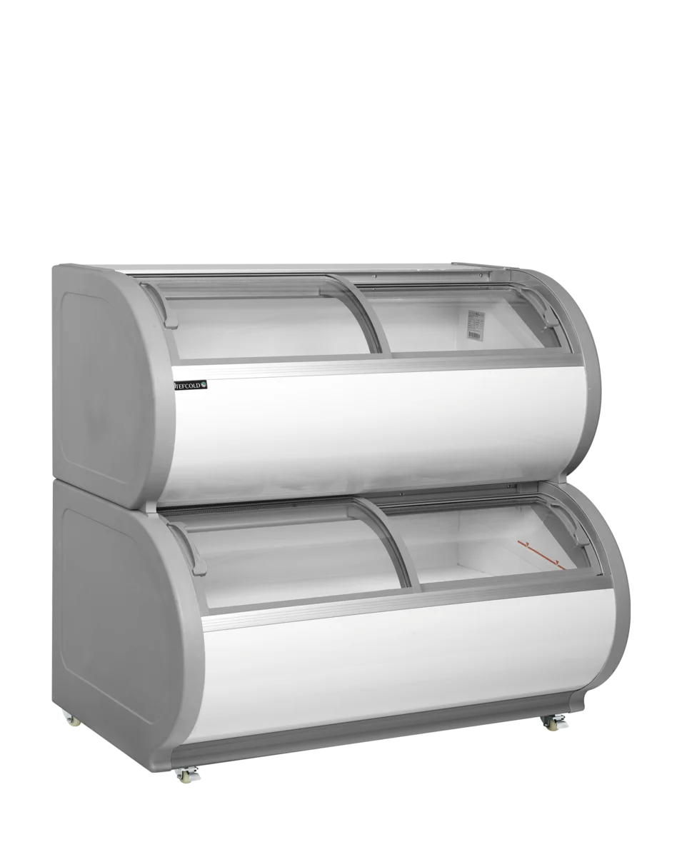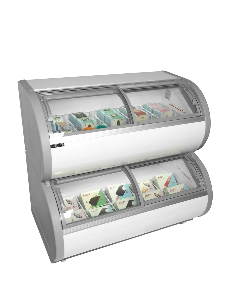 Optimieren Sie die Präsentation Ihrer Tiefkühlprodukte mit diesem innovativen Gefrierschrank auf zwei Ebenen. Er gibt den Kunden einen tollen Überblick, sodass sie in Ihrer Auswahl an Tiefkühlwaren leicht ihre Favoriten finden können, wie zum Beispiel leckeres Eis oder Eis am Stiel. Der Gefrierschrank ist geräumig und bietet Platz für 5 Körbe mit Trennwänden auf jeder Ebene. Die Beleuchtung der Produkte erfolgt über eine LED Beleuchtung, die über einen Schalter ein- und ausgeschaltet werden kann, wodurch Energie gespart werden kann, wenn der Laden geschlossen ist. Nutzen Sie das volle Potenzial des Gefrierschranks mit individuellem Branding.