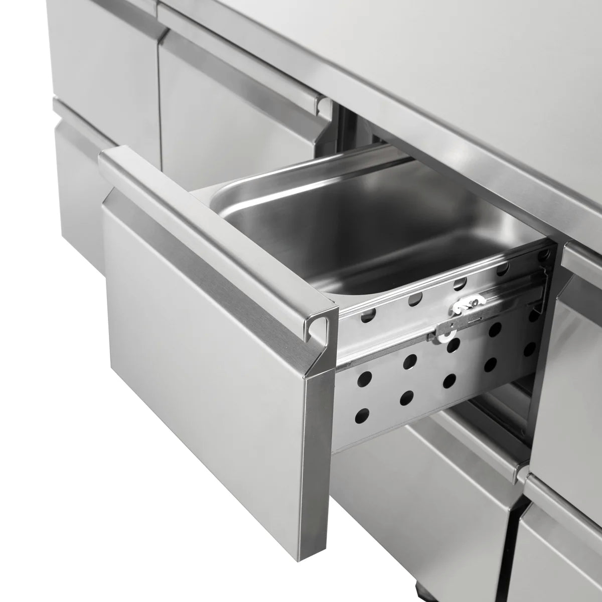 - Arbeitsplatte, Innenraum, Tür und Seitenteile aus hochwertigem Chrom-Nickel-Stahl