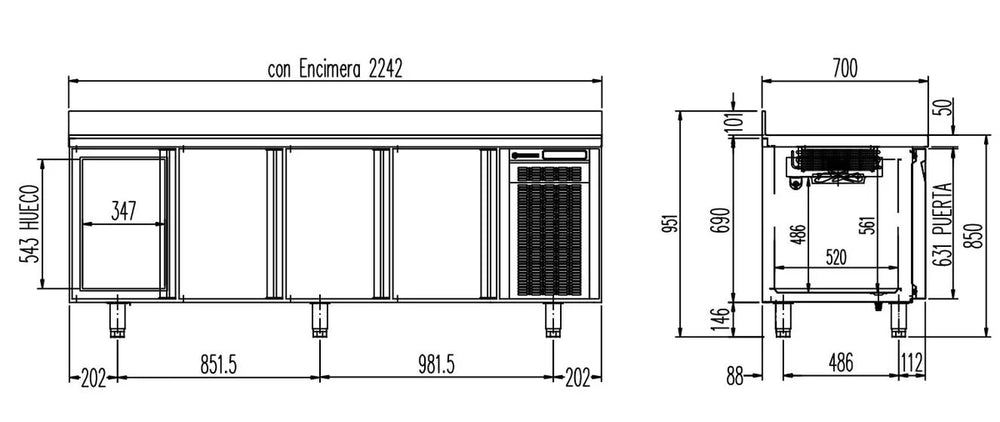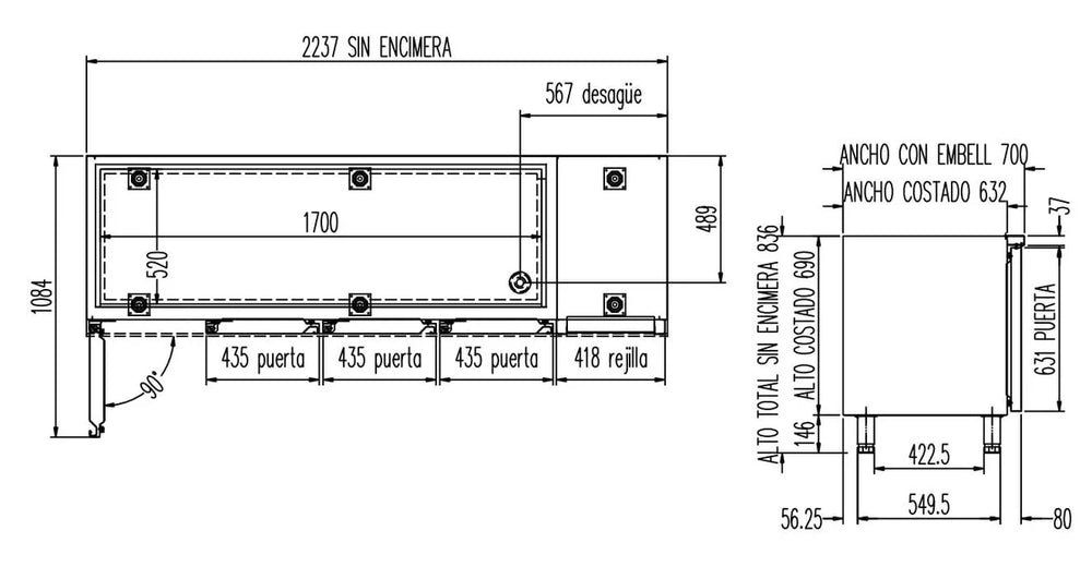 - Produktmaße (B x T x H): 2245 x 700 x 850 mm