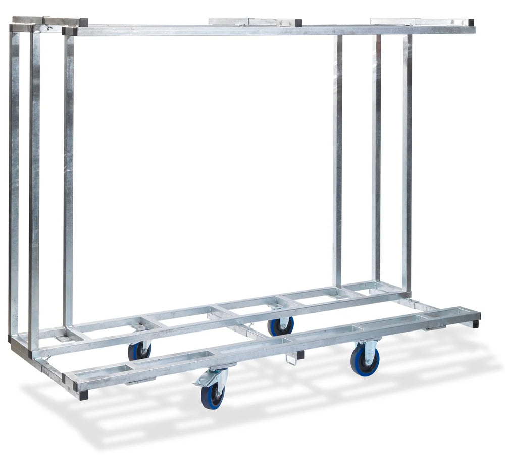 Dieser Transportwagen ist noch robuster als sein Vorgänger. Er ist zur Glänze galvanisiert und noch robuster und stabiler. Zudem ist er auch ausziehbar und eignet sich für alle Größen von Bierzeltgarnituren. Insgesamt können 10 komplette Garnituren transportiert werden. Außerdem ist es möglich, separat 20 Tische oder 40 Bänke zu transportieren. Der Wagen verfügt über 2 Bock- und Lenkrollen mit Feststeller zu 160 mm mit Kugellagern der Marke Torwegge.