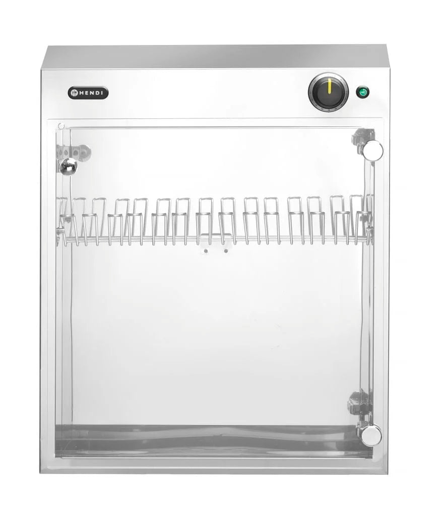 Der UV Sterilisator aus Edelstahl mit einer Plexiglastür bietet Platz für 14 Messer. Ihre Messer werden durch bakterizides ultraviolettes Licht sterilisiert. Der Sterilisator ist ausgestattet mit einem integrierten Timer, welcher bis zu 60 min einstellbar ist und einem Mikroschalter, der eine Bedienung bei geöffneter Tür verhindert.