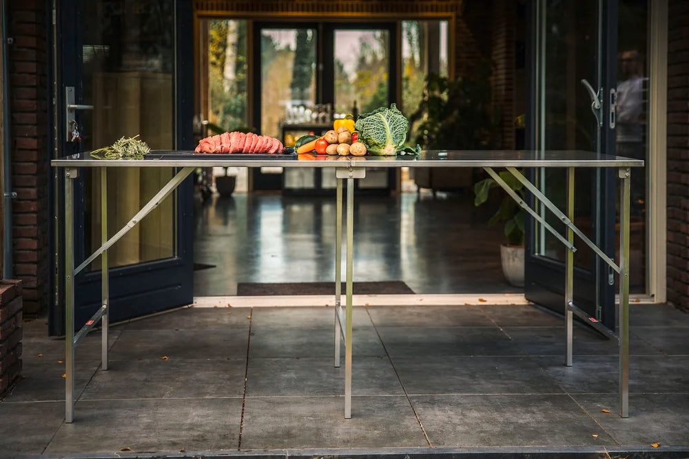 Dieser klappbare Edelstahl-Arbeitstisch wurde speziell für Cateringunternehmen und Vermieter entwickelt. Er verfügt über einen klappbaren Aluminiumrahmen. Dieser Arbeitstisch eignet sich vor allem sehr gut für verschiedene Anwendungen, weil der Tisch klappbar ist. Der Tisch ist mit seiner Arbeitsplatte aus Edelstahl und seinem leichten, aber stabilen Aluminiumgestell äußerst hygienisch (zertifiziert nach HACCP) und in noch nicht einmal einer halben Minute aufgebaut! Zudem kann unterschiedlicher Zubehör bestellt werden wie Unterlegplatten, Erhöhungsplateaus und Warmhaltebrücken. Tragfähigkeit je Arbeitsplatte: 80 kg