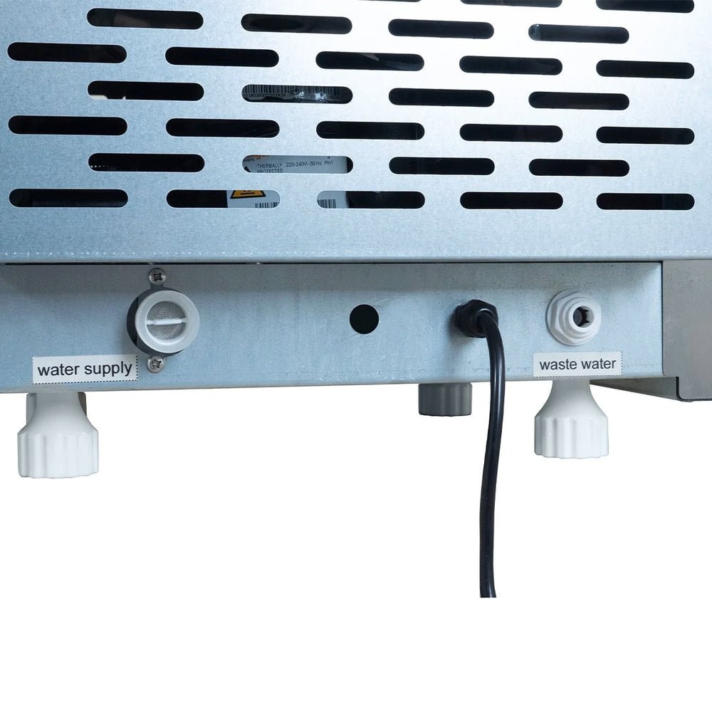 - Geräte mit Festwasseranschluss müssen, mit einer geeigneten Wasseraufbereitung, von einem Fachmann installiert und in Betrieb genommen werden.