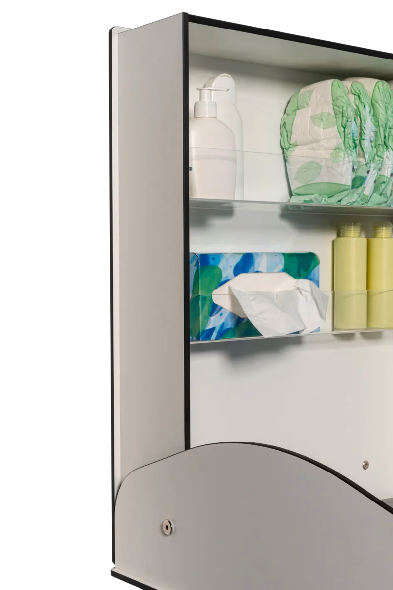 - mit eingebautem Regalboden für Windeln und Pflegeartikel