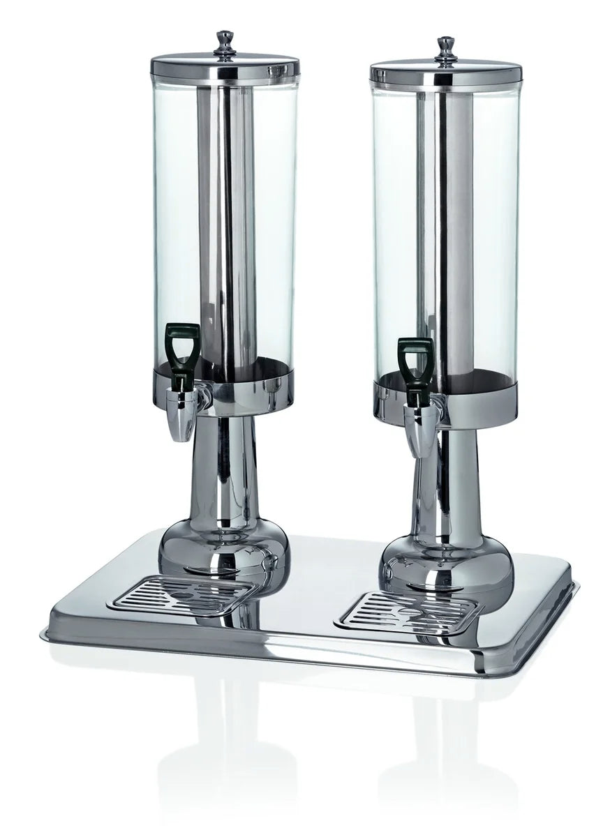 Ein modern gestalteter Saftdispenser mit 2 Behältern, der es Ihnen ermöglicht Ihren Gästen zwei verschiedene Sorten Kaltgetränke auf dem Buffet anzubieten. Die Kühlfunktion dieses Dispensers wird durch Crushed-Eis in den Mittelrohren gegeben. Die Behälter bestehen aus Polycarbonat, Standfuß und Deckel wurden aus Edelstahl gefertigt.